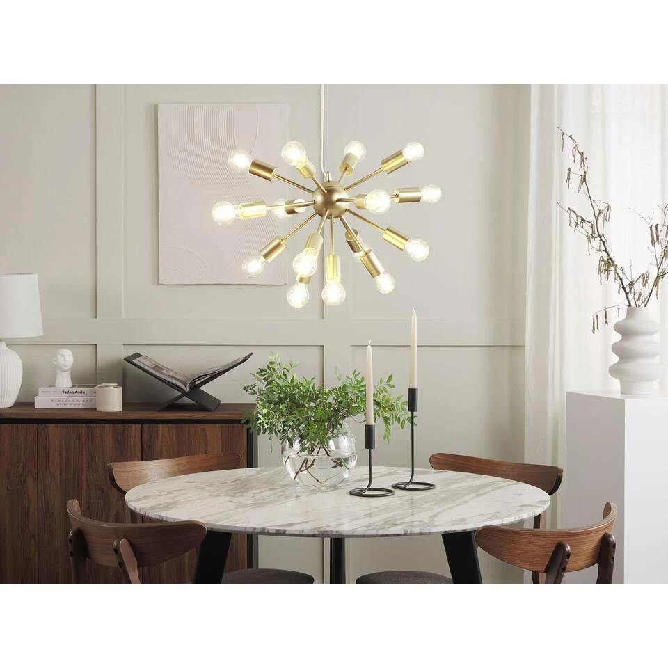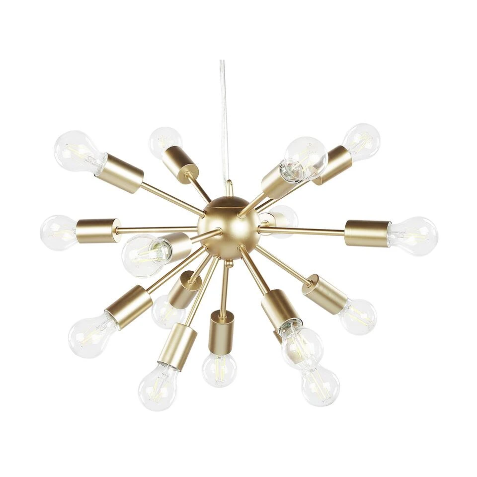 Glitter Plafondlamp. Verfraai je woonkamer of eetkamer met deze mooie moderne hanglamp. De lamp is gemaakt van ijzer met een gouden afwerking, die een gezellige uitstraling geeft aan elk interieur. In het karakteristieke ontwerp passen 15 decoratieve gloeilampen, waardoor zijn stijl tot recht komt, terwijl de kamer volledig wordt verlicht.