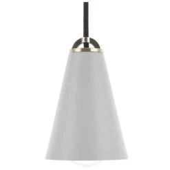 Kegelvormige hanglamp in grijs. De slanke, conische lampenkap van grijs metaal is een blikvanger met een moderne flair dankzij het smalle, messingkleurige handvat aan de bovenrand. Dankzij het heldere ontwerp en het subtiele kleurenschema past de hanglamp perfect bij moderne, industriële en stedelijke interieurontwerpen, maar ook bij jeugdig, minimalistisch of Scandinavisch design. Een zwarte textielkabel en een ronde luifel van zwart metaal worden gebruikt voor plafondmontage. De lamp is geschikt voor lampen met een E27-fitting van maximaal 40W. Een lichtbron is niet inbegrepen.