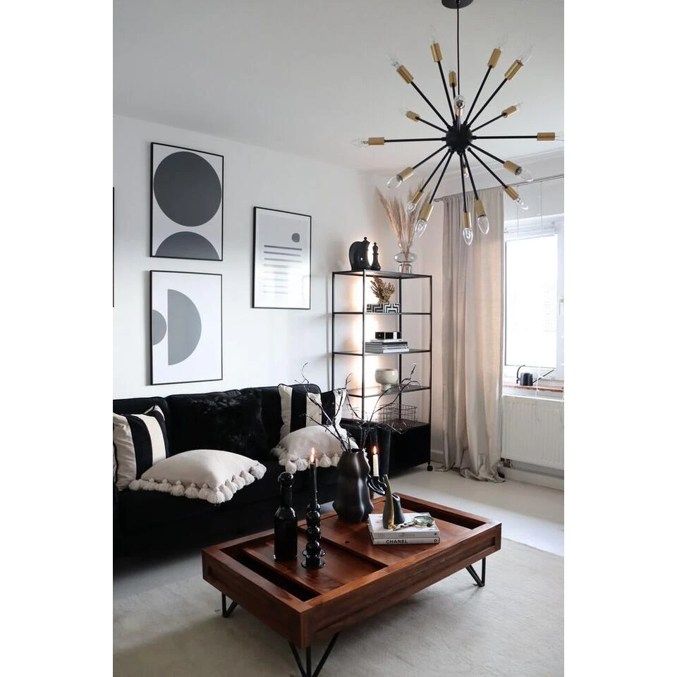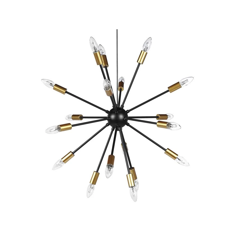 Moderne, speelse hanglamp in zwart. Een geweldig licht accent aan de eettafel. Het extravagante uiterlijk van de decoratieve ijzeren lichtgroep maakt het een echte blikvanger. Bovendien is het niet alleen een mooi thuisaccessoire, maar biedt het ook hun licht voor een aangename, warme sfeer in de kamer.