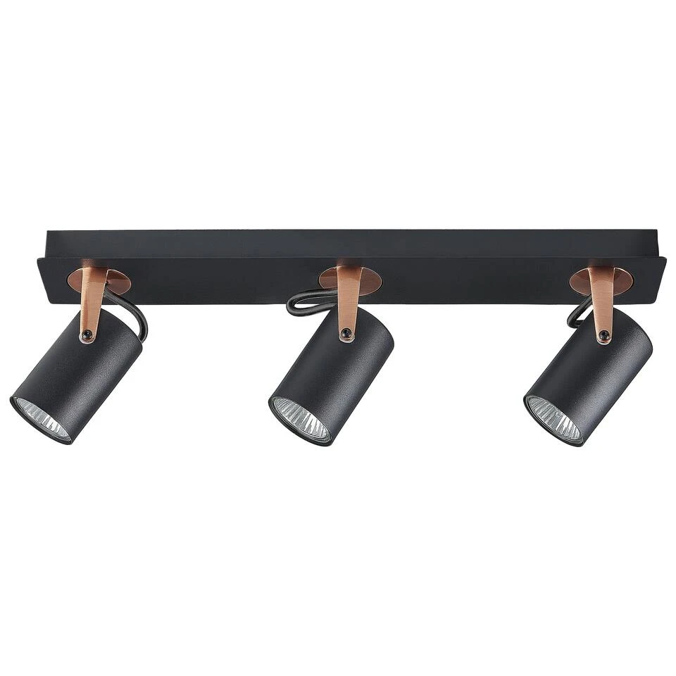 Verstelbare industriële plafonniere. Deze zwarte plafondlamp zal een stijlvol en functioneel element zijn in elke woon- of slaapkamer. Dankzij het gebruiksvriendelijke mechanisme kan de hoek van de lampenkappen eenvoudig in elke richting worden aangepast, waardoor het licht gelijkmatig wordt verdeeld en het een geweldige werklamp is. Gemaakt van metaal met zwarte en koperen elementen, de lamp is perfect voor zowel industrieel geïnspireerde decors als meer traditionele interieurs.
