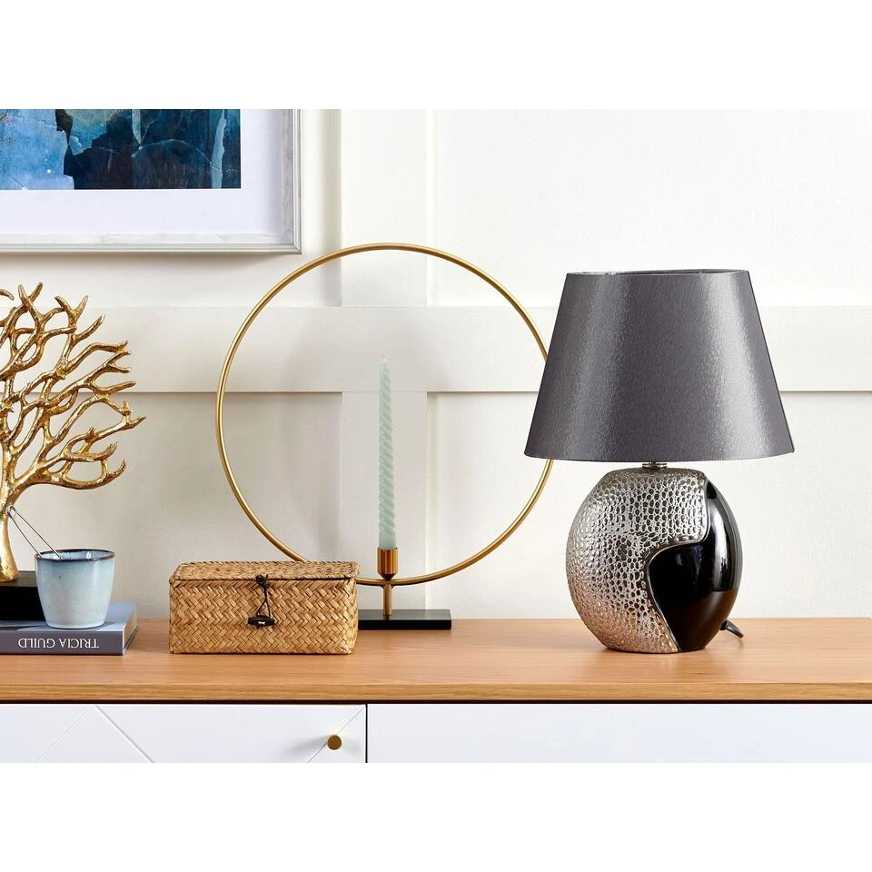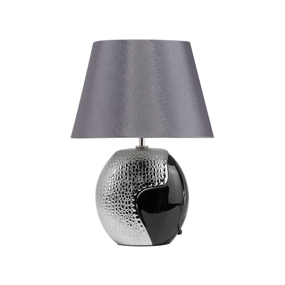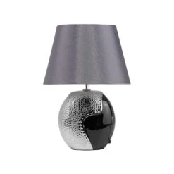 Elegante zilveren tafellamp . Dankzij de elegantie die deze lamp met zich meebrengt, kan deze tafellamp worden gecombineerd met alle inrichtingsstijlen. De ovale, conisch gevormde lampenkap van glanzende, zilveren kunstzijde en de zilverkleurige lampvoet zijn harmonieus in kleur afgestemd. Dit reflecteert het licht prachtig.