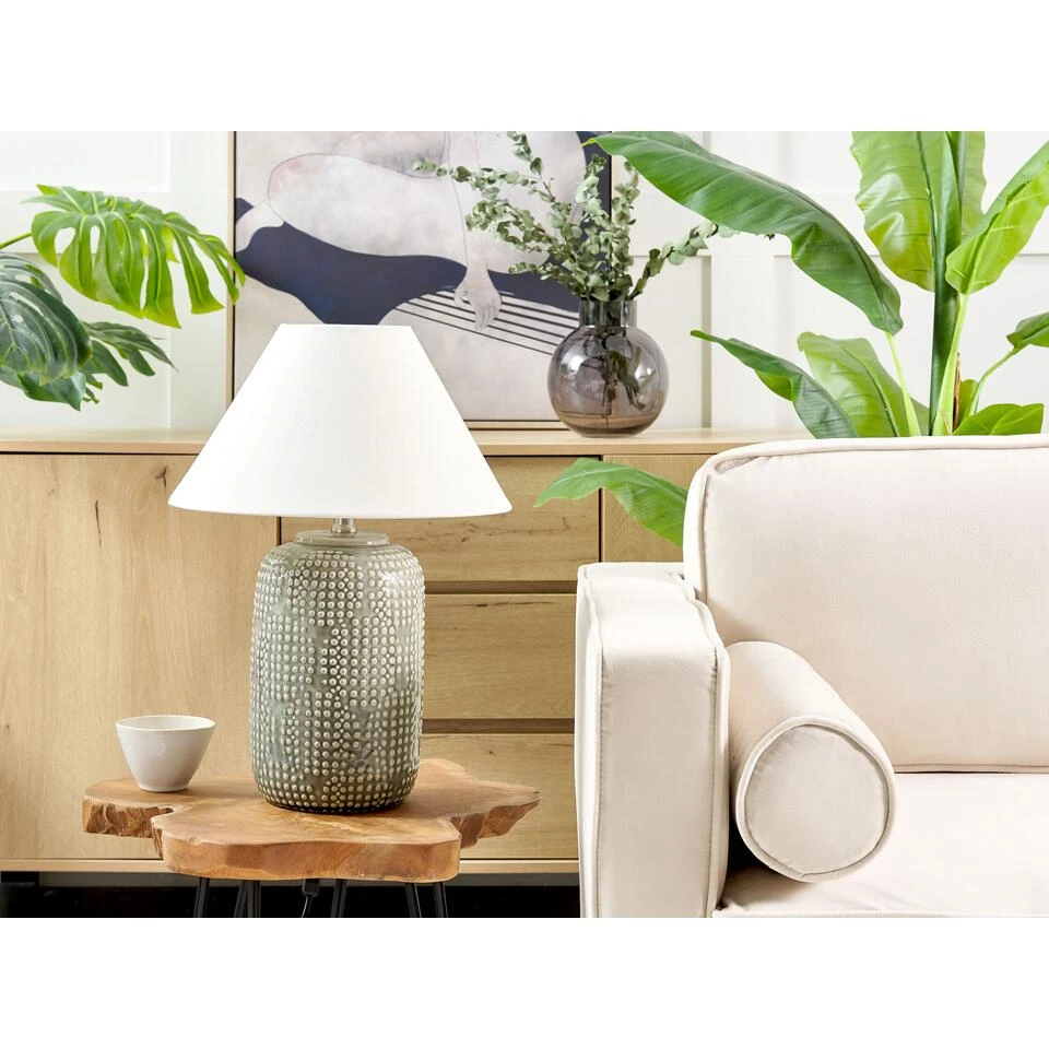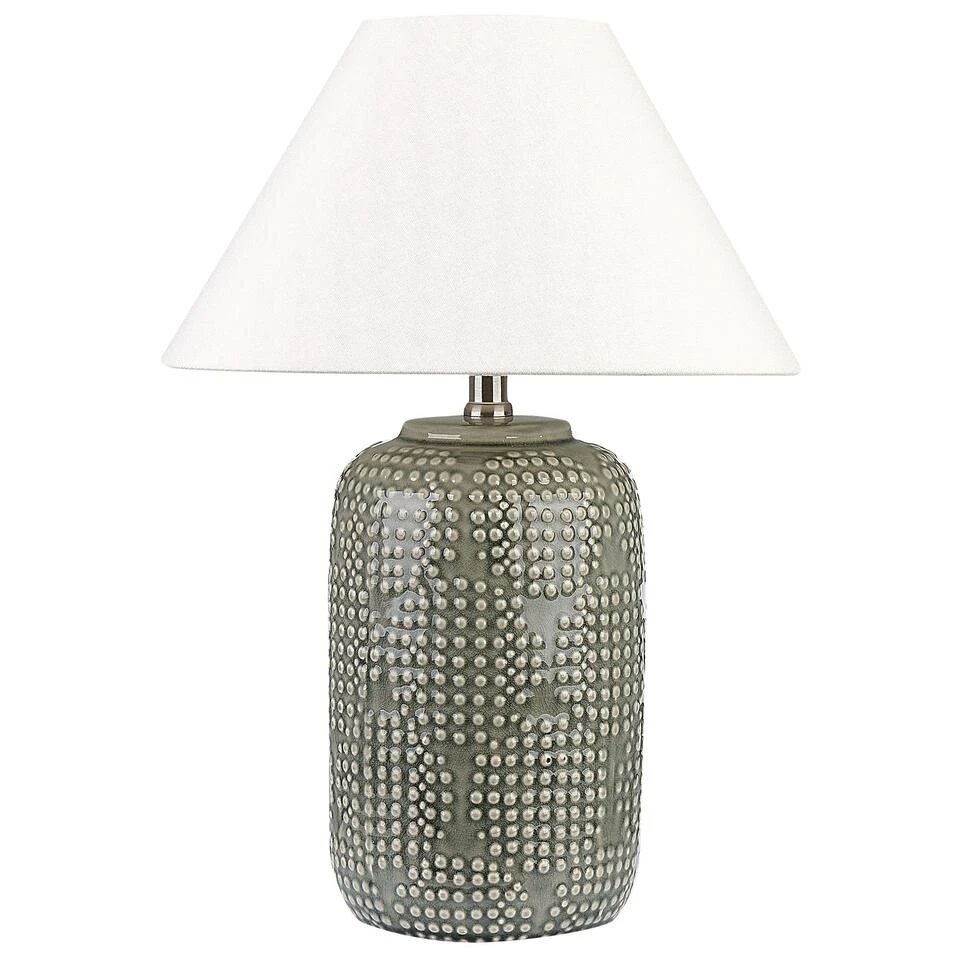 Stijlvolle tafellamp met siervoet. Voeg deze prachtige lamp toe aan je interieur en laat hem de hele look opvrolijken. De decoratieve voet in universele grijze kleur met een uitgesneden patroon is een echte blikvanger die perfect contrasteert met de klassieke trommelvormige kap. Het product geeft een delicaat diffuus licht dat een gezellige sfeer creëert wanneer het buiten donker wordt.
