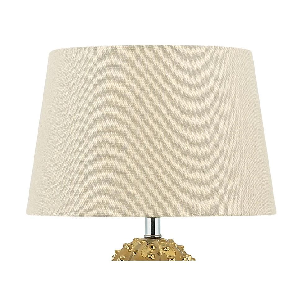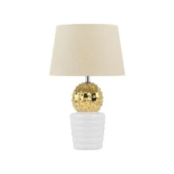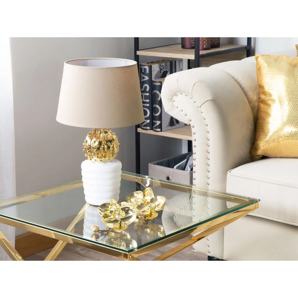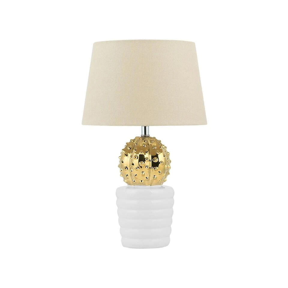 Tafellamp met cactuslook. Deze tafellamp combineert beide: klassieke kleuren en een ongewoon ontwerp. De speelse cactusvorm in goud-wit maakt de lamp het perfecte accessoire voor je woonkamer, slaapkamer en kinderkamer. De beige tint in een enigszins conische vorm geeft een aangenaam licht en straalt een warme sfeer uit.