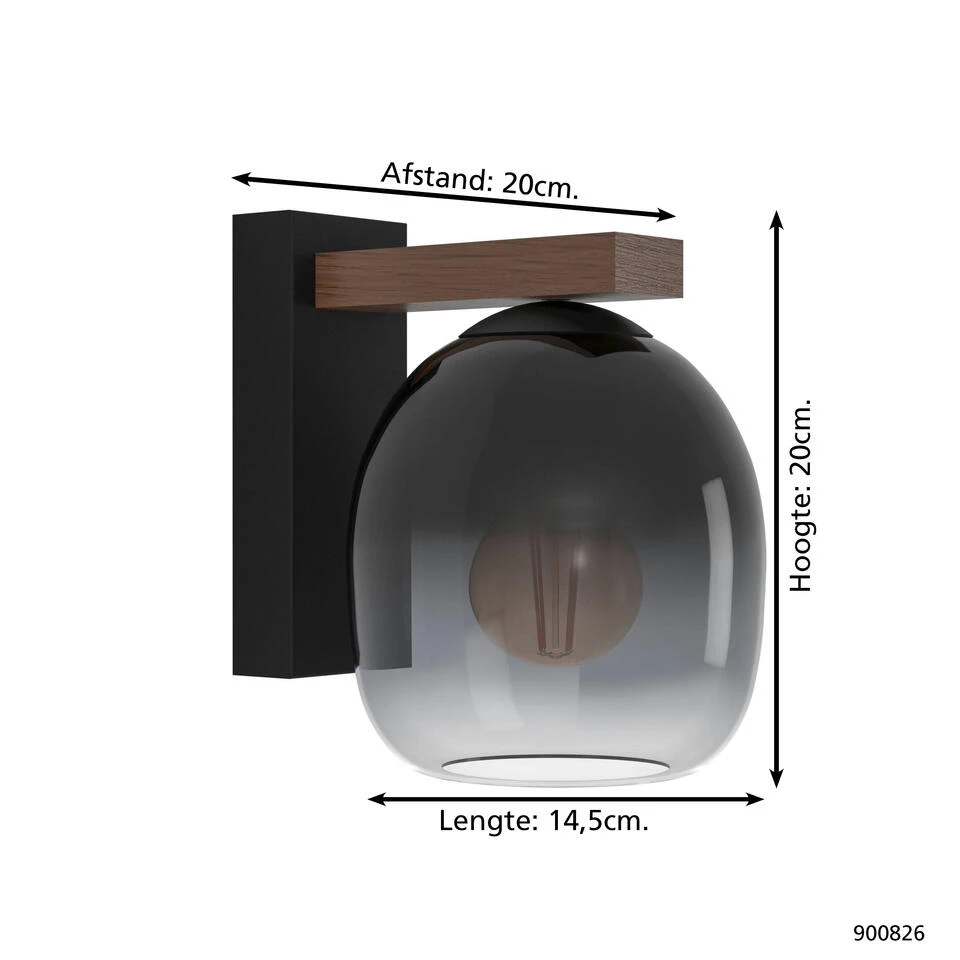Een knappe wandlamp Filago van EGLO die perfect bij de nieuwe interieurtrends past. Met zijn compacte formaat is deze wandlamp een perfecte aanvulling op elke kamer. Het unieke ontwerp combineert hoogwaardig hout, staal en glas. De zwarte wandbevestiging vormt een elegant contrast met het bruine hout, terwijl het glas voor een betoverend ombre effect zorgt dat de aandacht trekt. Dit geeft de lamp een unieke uitstraling die zeker indruk zal maken. Of het nu de woonkamer, slaapkamer, hal of studeerkamer is, de lamp zal elke ruimte transformeren met zijn prachtige uitstraling. Laat de EGLO Filago wandlamp stralen in jouw interieur en voeg een vleugje moderne elegantie toe aan elke kamer.