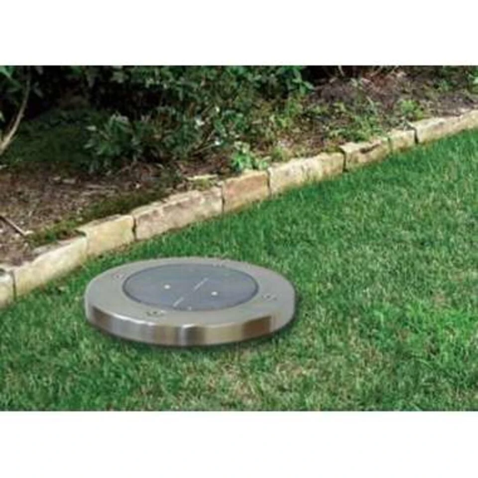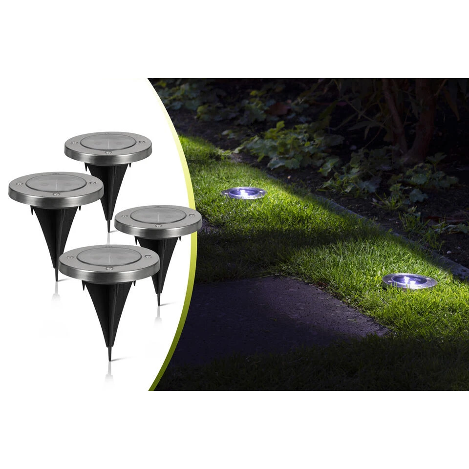 Set van 4 LED spotlights: deze handige spotlights voor buiten zijn ideaal om jouw tuin of oprit te verlichten. De lichtspots werken op zonne-energie en zijn gemaakt van roestvrij staal, IP44 waterbestendig. Buitenverlichting op zonne-energie: omdat de grondspots op zonne-energie werken, is elektriciteit niet nodig. De ronde buitenverlichting heeft een oplaadtijd van 6 uur en gaan, afhankelijk van de weersomstandigheden, ongeveer 8 uur mee. Waterdichte tuinverlichting: deze waterdichte lampjes verlichten de tuin prachtig, zonder dat je je zorgen hoeft te maken over zware regenval, sneeuw of vorst. De grondspots zijn allen voorzien van 2 witte LED lichtjes. Solar grondspots: de buitenlampjes zijn enorm eenvoudig te installeren, zonder al dat gedoe met bedradingen. De lichtjes hebben grondankers, waardoor ze eenvoudig in de grond te steken zijn. Wanneer het donker wordt gaan de lichtspotjes vanzelf aan en gaan automatisch uit wanneer het licht wordt. Moderne tuinverlichting details: solar panel: 2 Vdc – 60 mA; oplaadbare batterij: 400 mAh NiMH (type: AAA); LED: 2x wit licht per spot (totaal 0.12W LED vermogen, per spot); water bestendig IP44; afmetingen: 13.5 x 11.6 x 11.6 cm (LxHxB); hoogte: 13,5 cm incl. grondanker; hoogte: 1,5 cm excl. grondanker; gewicht: 115 gram.