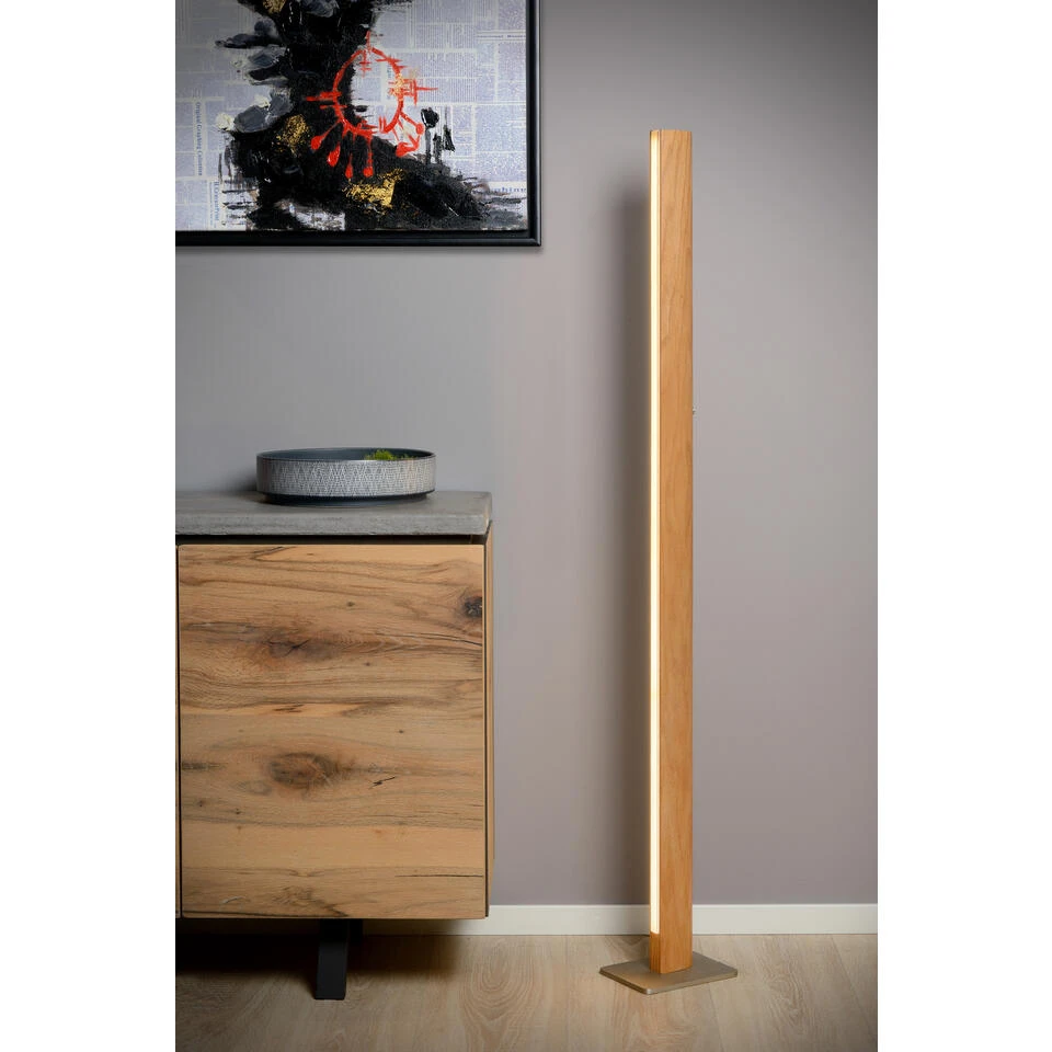 Een houten lichtbaken vermomd als een 151,5 cm hoge brok elegantie. Sytze kenmerkt zich door zijn natuurlijke en tegelijk moderne uitstraling. Deze vloerlamp heeft een originele lichtprojectie, die er zich perfect toe leent om een item in je interieur te accentueren. Ook als subtiele sfeermaker is Sytze geschikt. Zijn warm wit licht is dimbaar via de knop op de lamp. Zo bepaal je meteen de juiste sfeer voor elke gelegenheid. De staande lamp werkt met geïntegreerde led-technologie en wordt geleverd met dimbare lichtbron.
