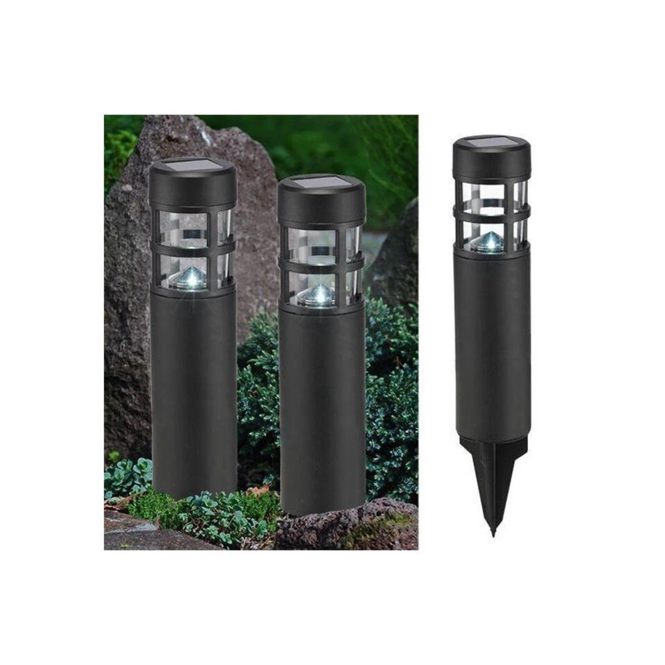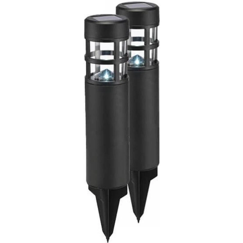 2x Buitenlampen/tuinlampen LED solar verlichting op zwarte steker/grondpin/grondpen. Verlicht het tuinpad/looppad of licht een plantenborder uit met meerdere van deze lampen. De lampen zijn milieuvriendelijk aangezien ze zelfvoorzienend zijn in stroom dankzij de zonnepanelen. U kunt de lamp overal plaatsen en ook weer verplaatsen omdat u geen elektriciteitsdraden hoeft te spannen.