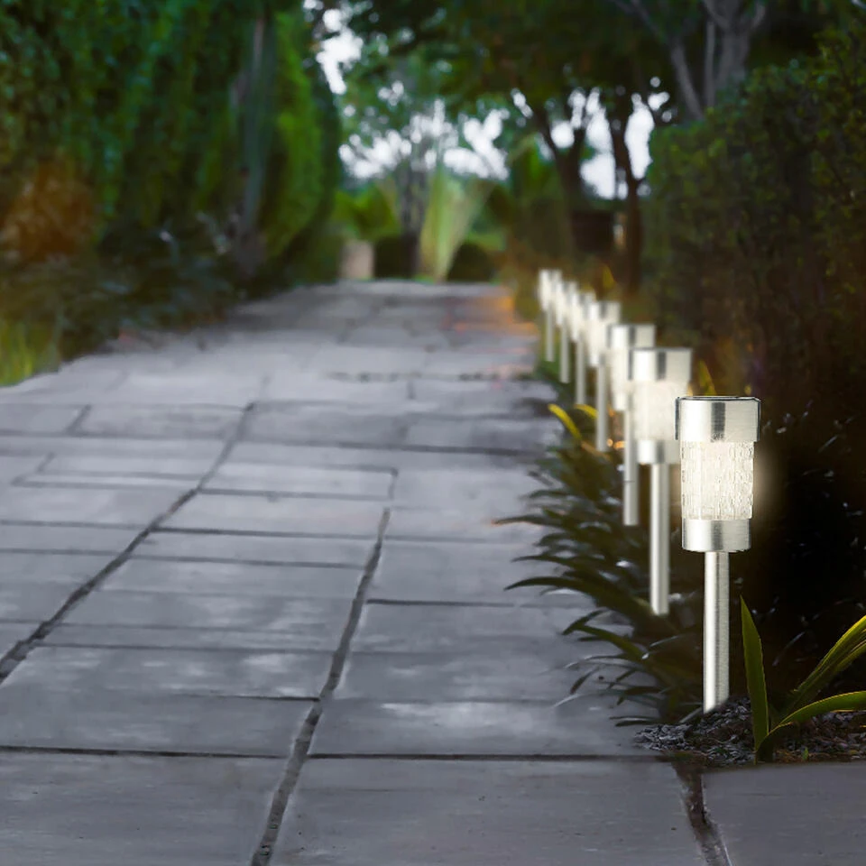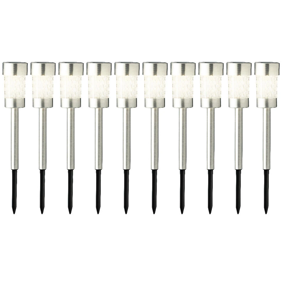 Lumineo 10x stuks solar prikspots/tuinspots LED verlichting voor in de tuin. Deze spots werken op zonne-energie waardoor ze zichzelf opladen gedurende de dag. Met de grondpin kunnen de spotlights eenvoudig langs een looppad of op een andere plek in de tuin geplaatst worden. Set bestaand uit 10x prikspots. *Specificaties**