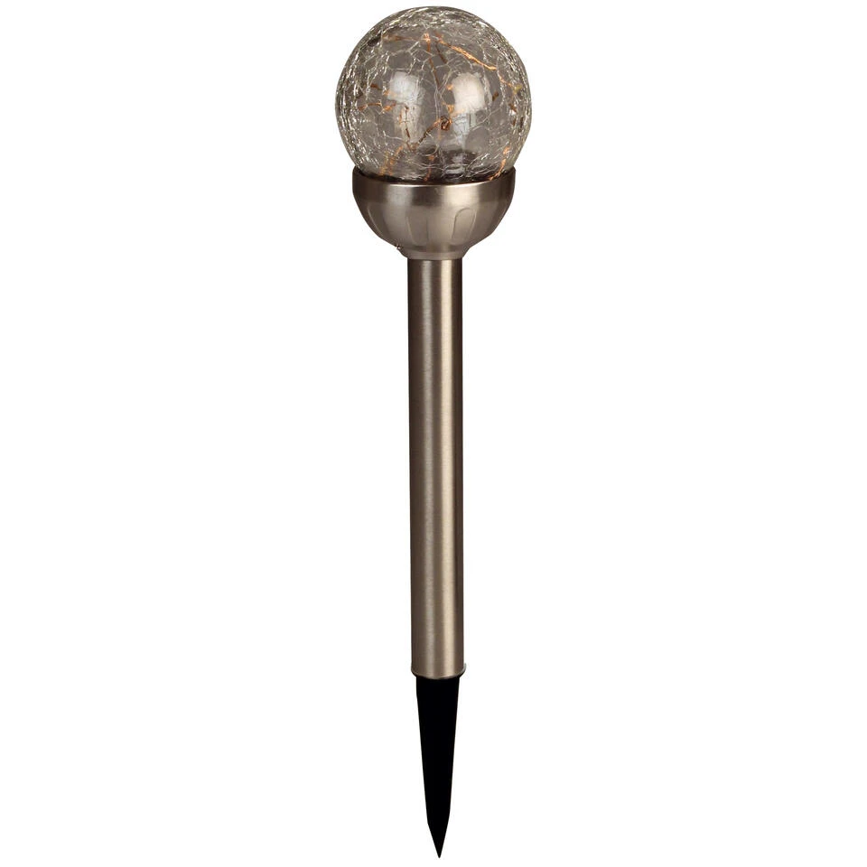 1x Solar tuinlamp met Softtone effect LED verlichting voor in de tuin. De milieuvriendelijke LED tuinfakkel heeft 1 LED lamp per lamp en werkt op zonne-energie waardoor deze zichzelf opladen gedurende de dag, als de lamp volledig is opgeladen heeft deze ongeveer 6 branduren. De warmwitte LED in de bol zorgt voor een mooi lichtpatroon rondom de plek van de lamp. Er is ook de mogelijkheid om de lamp in 3 opeenvolgende kleuren (rood, groen, blauw) te laten branden. Deze lamp is uitgevoerd met steker waardoor de lamp gemakkelijk in de aarde te prikken/steken is. Schakelaar: nee. Kleur licht: Softtone effect. Kleur: RVS. Afmeting: D6 x H35 cm. Solar paneel: 2V 40 mA. Batterij: 1 x 1.2V AAA 100 mAh (oplaadbaar). Materiaal: glas en RVS. Tuinlampen/tuinverlichting/prikspots op zonne-energie.