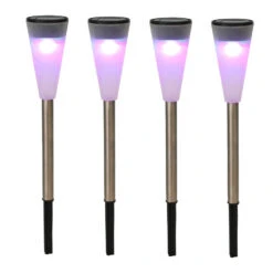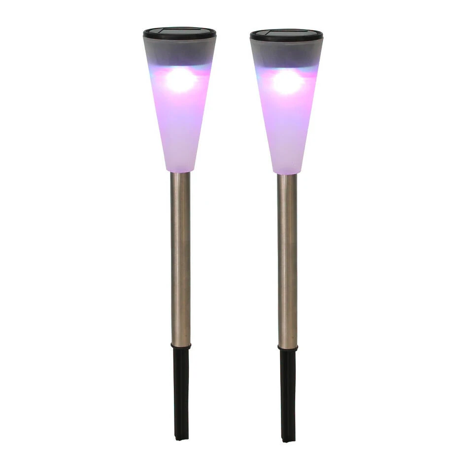 1x RVS Buiten/tuin LED stekers solar verlichting 36 cm gekleurd. 1x Buitenlampen/tuinlampen LED solar verlichting op steker/grondpin/grondpen. De verlichting is gekleurd en verandert automatisch van kleur afwisselend met de kleuren rood, groen en blauw. De lampen zijn milieuvriendelijk aangezien ze zelfvoorzienend zijn in stroom dankzij de zonnepanelen. U kunt de lamp overal plaatsen en ook weer verplaatsen omdat u geen elektriciteitsdraden hoeft te spannen.