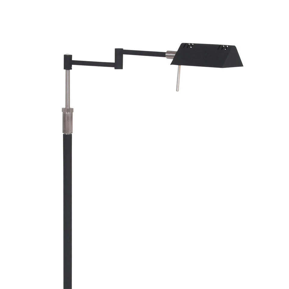 Functionele zwarte vloerlamp. Deze design moderne vloerlamp is afkomstig uit de Mexlite Karl serie. De diameter van de voetplaat is 23 centimeter. Het kapje heeft een lengte van 12,5 centimeter bij 9,5 centimeter. Wordt inclusief snoer van 172 centimeter geleverd. In hoogte verstelbaar tot maximaal 146 centimeter. Draai- en kantelbaar. Beschikt over pushdimmer. Ingebouwde Geïntegreerde LED module van 10 watt, vervangbaar door de fabrikant. De Geïntegreerde LED module heeft als kleur 2700 Kelvin en de licht opbrengt is 900 Lumen.