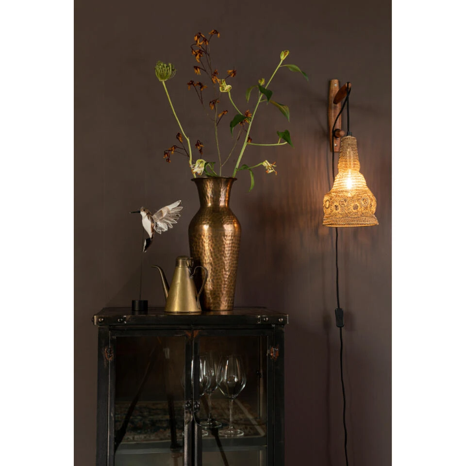 Creëer in een handomdraai een gezellige en botanische sfeer in jouw favoriete ruimte met de Alta wandlamp! Deze wandlamp is uitgerust met een stevige naturelkleurige mangohouten basis, waaraan de lampenkap hangt. De lampenkap valt op door zijn stijlvolle vorm en patroon, en is geheel gemaakt van messingkleurig mesh. Dankzij het gebruik van mesh, behoudt deze lamp zijn open uitstraling en schijnt het licht prachtig de ruimte in. Om deze wandlamp gemakkelijk aan/uit te schakelen, is hij voorzien van een zwarte getextureerde polyester kabel met schakelaar. Exclusief E27 lichtbron.