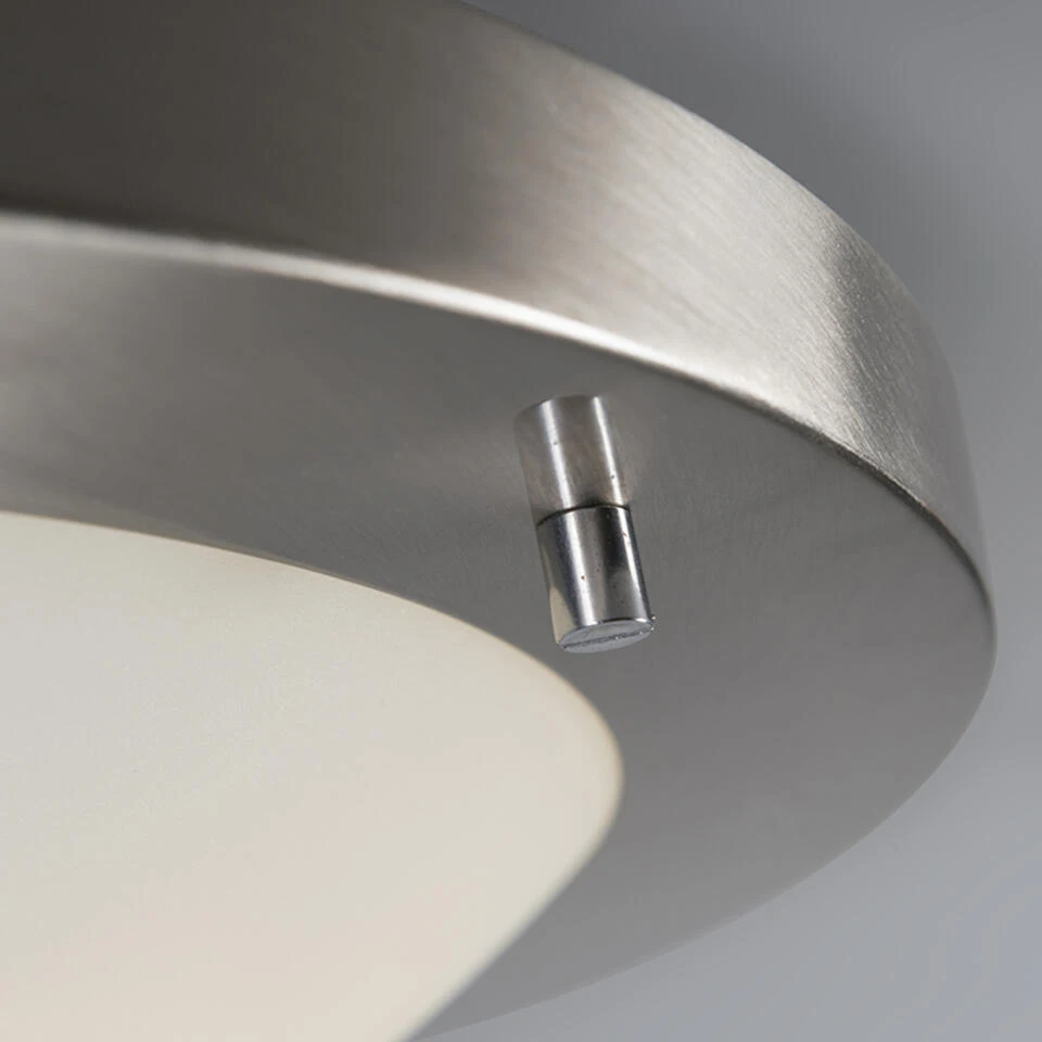 De Yuma is een grote strakke, moderne plafondlamp in een hoogwaardige staal kwaliteit die goed tegen water kan! Hij heeft een IP-waarde van IP44 en is daarom te plaatsen in de badkamer of eventueel in de garage (vochtige ruimtes). De plafondlamp Yuma is prachtig afgewerkt met een matte bolvormige glasplaat aan de onderzijde waardoor een rustig lichteffect gecreëerd wordt. Hij heeft een diameter van 41 cm en is 8 cm hoog. Tevens verkrijgbaar in verschillende doorsnedes, voor elk wat wils! De lamp wordt zonder lichtbron geleverd, bestel er dus nog twee lichtbronnen passend in een grote E27 fitting bij. Deze plafonnière is dimbaar met externe dimmer (dimmer niet inbegrepen).