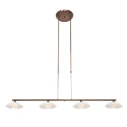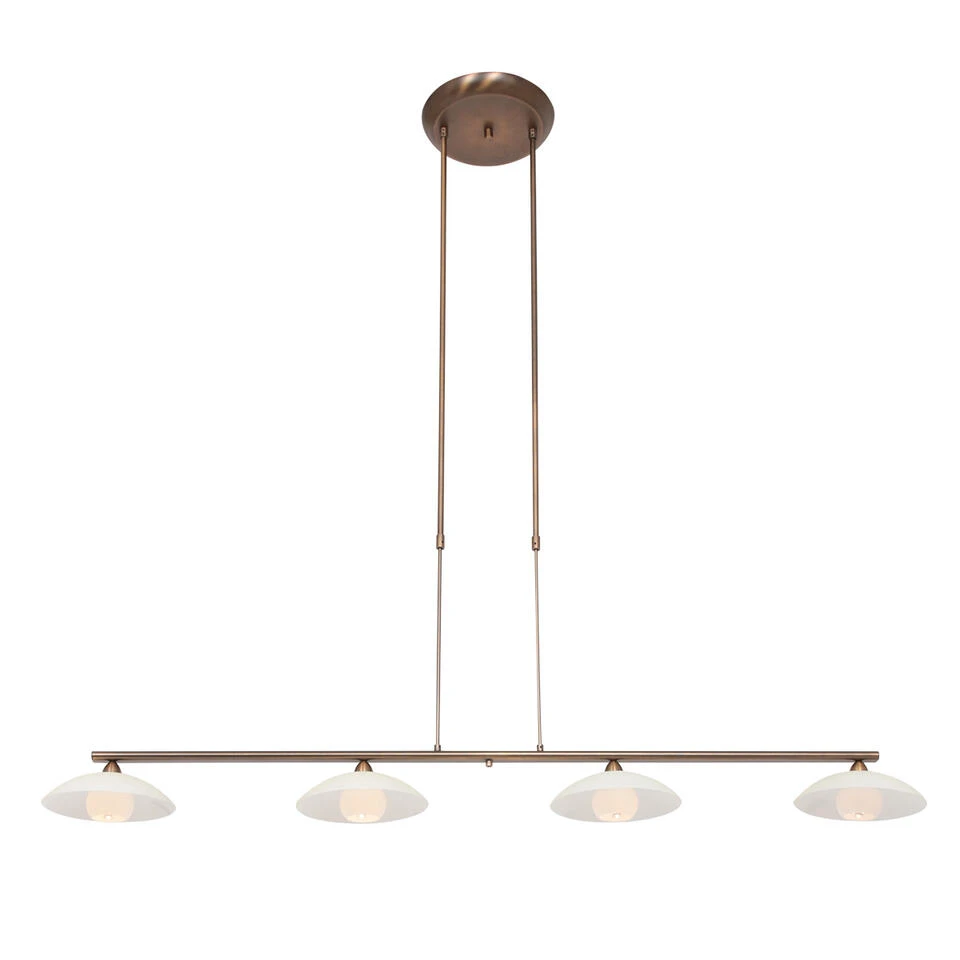 Hanglamp uit de serie sovereign classic LED. Vervaardigd uit geborsteld bronskleurig staal. Dit armatuur is in hoogte verstelbaar van 80 centimeter tot max. 120 centimeter. Onder het crème kleurig glazen schoteltje bevind zich een wit bolletje die er voor zorgt dat men niet direct tegen het LED lampje kijkt. Deze lamp wordt geleverd inclusief 4 G9 LED lichtbronnen van 3 Watt met 300 Lumen en 2700 Kelvin. Hanglamp is dimbaar middels een push dimmer verwerkt in het armatuur.