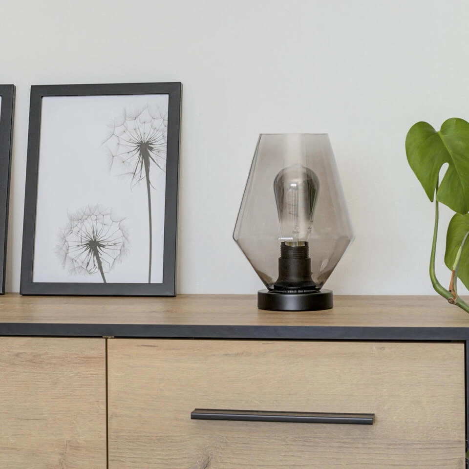 De tafellamp Ancilla is een zwarte tafellamp met een donker kleurig glas. De totale hoogte is 32 centimeter. Voorzien van een E27 fitting. (Lichtbron niet meegeleverd) Het armatuur is voorzien van een zwart snoer waar een aan / uit schakelaar in is verwerkt.